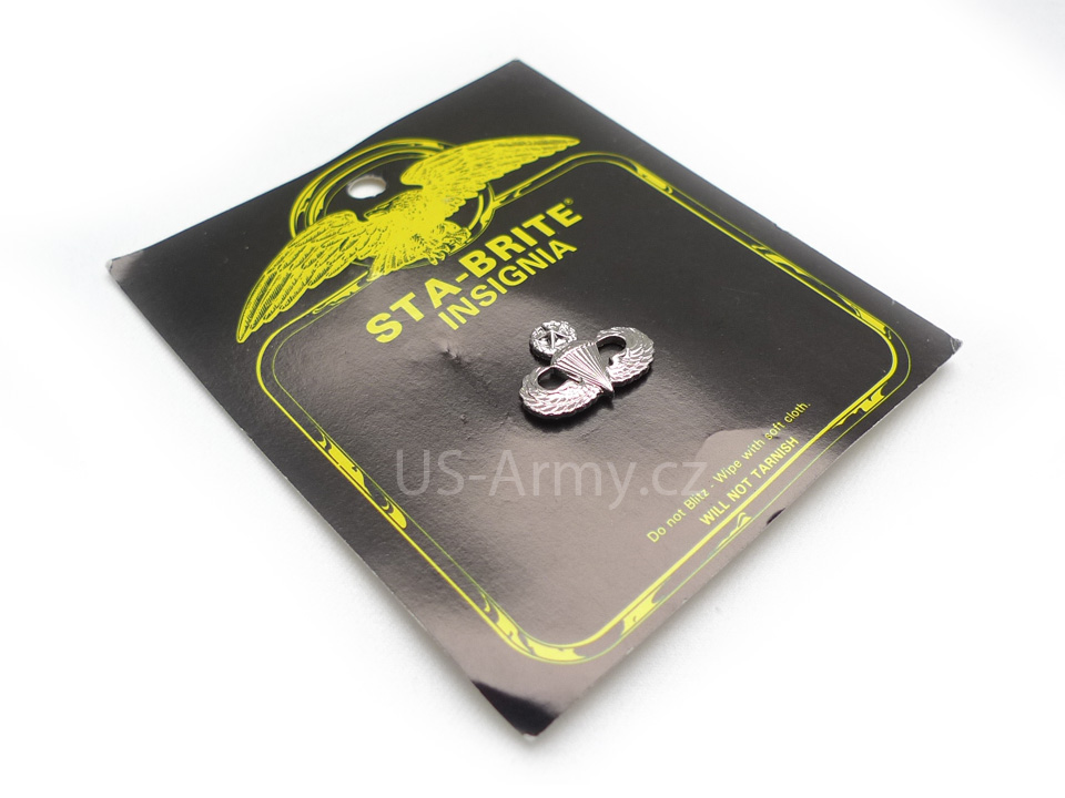 Originální americký odznak U.S. Army za seskok padákem (Master Paraschutist Badge) v lesklém stříbrném provední na uniformu. Mini size - mini velikost (cca 3cm). Stav nepoužitý.